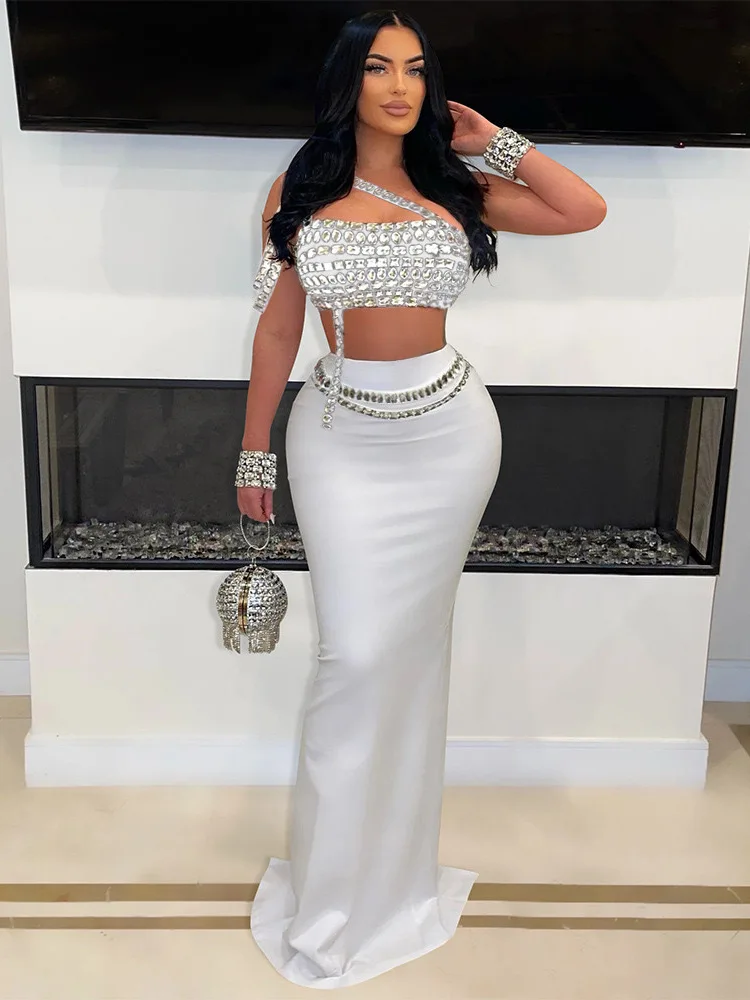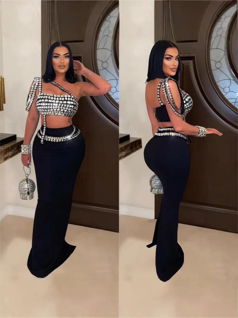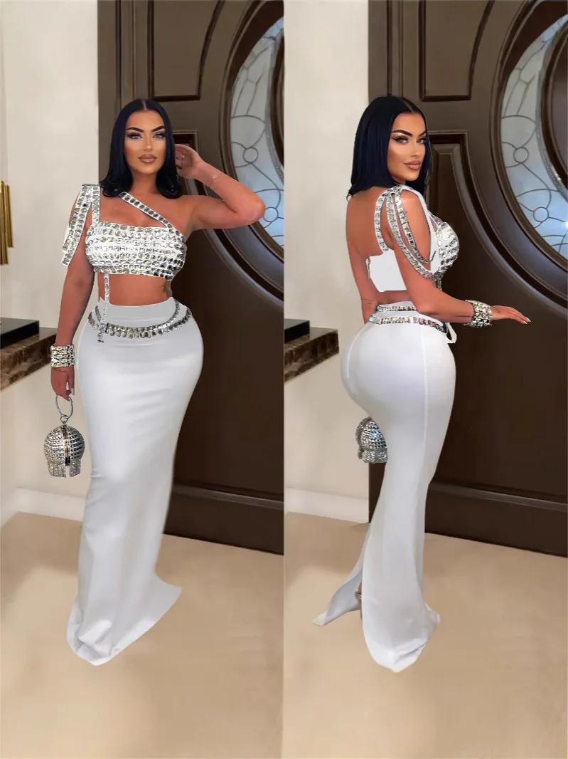 European American Women's AliExpress Summer Skinny Solid Color Navel Rhinestone Inclined Shoulder Tube Top Half Dress Set